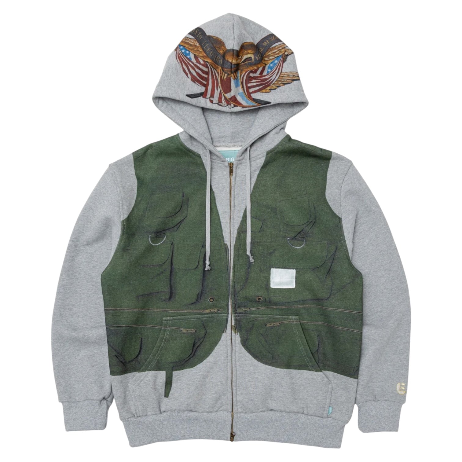 450 GSM cotton fleece hoodie with antique brass double zip. An authentic vintage fisherman's vest is digitally printed over the torso in fine detail. "El Dia De Mi Suerte" artwork is printed over the hood featuring the Lares flag alongside the American flag in Lares colors. Embroidered B Logo on the wrist.